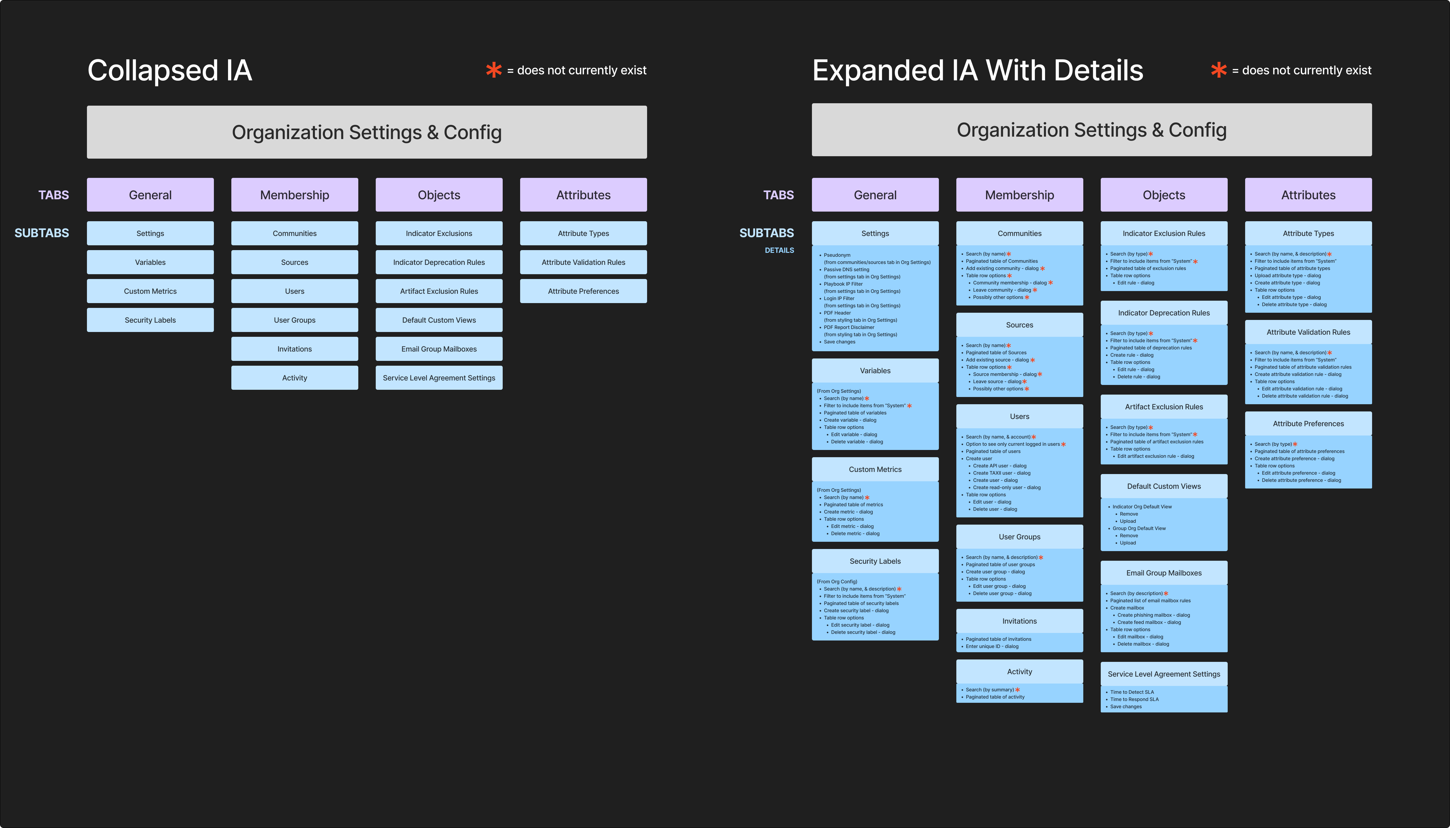The administrative parts of the ThreatConnect threat intelligence platform (TIP) were developed a decade prior to redesign, in a way that was not scalable or sustainable. Additional settings were largely added in an ad-hoc manner, causing the settings to become bloated and cumbersome for internal and external users.This herculean endeavor was undertaken by both developers and UX, with UX completely reimagining the IA and design.