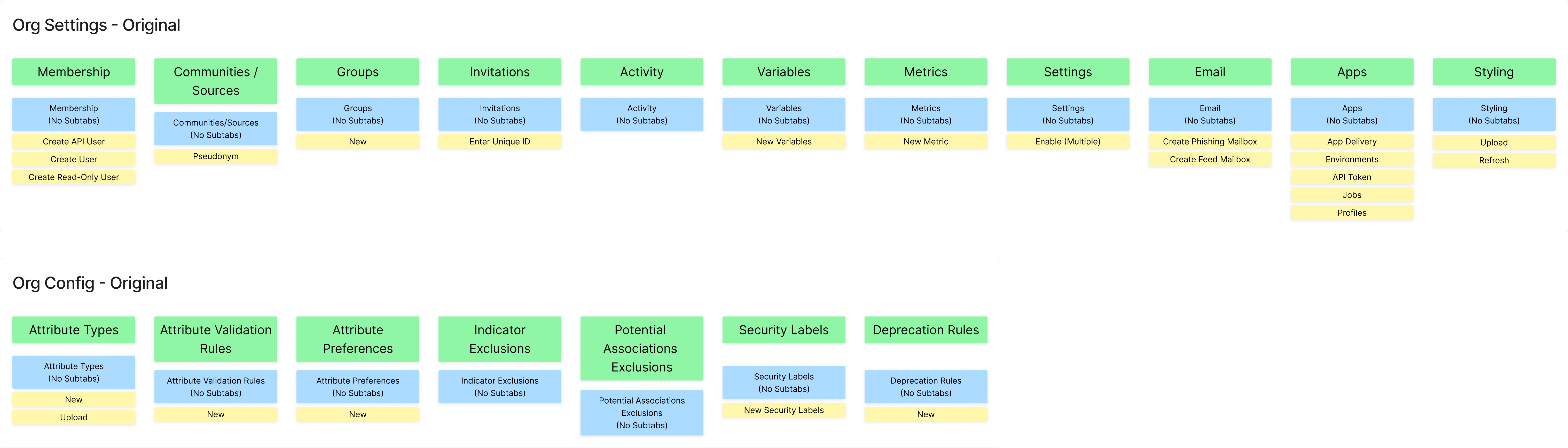 To have a similar hierarchy, we landed on the following 4 top-level tabs for the org admin settings:
