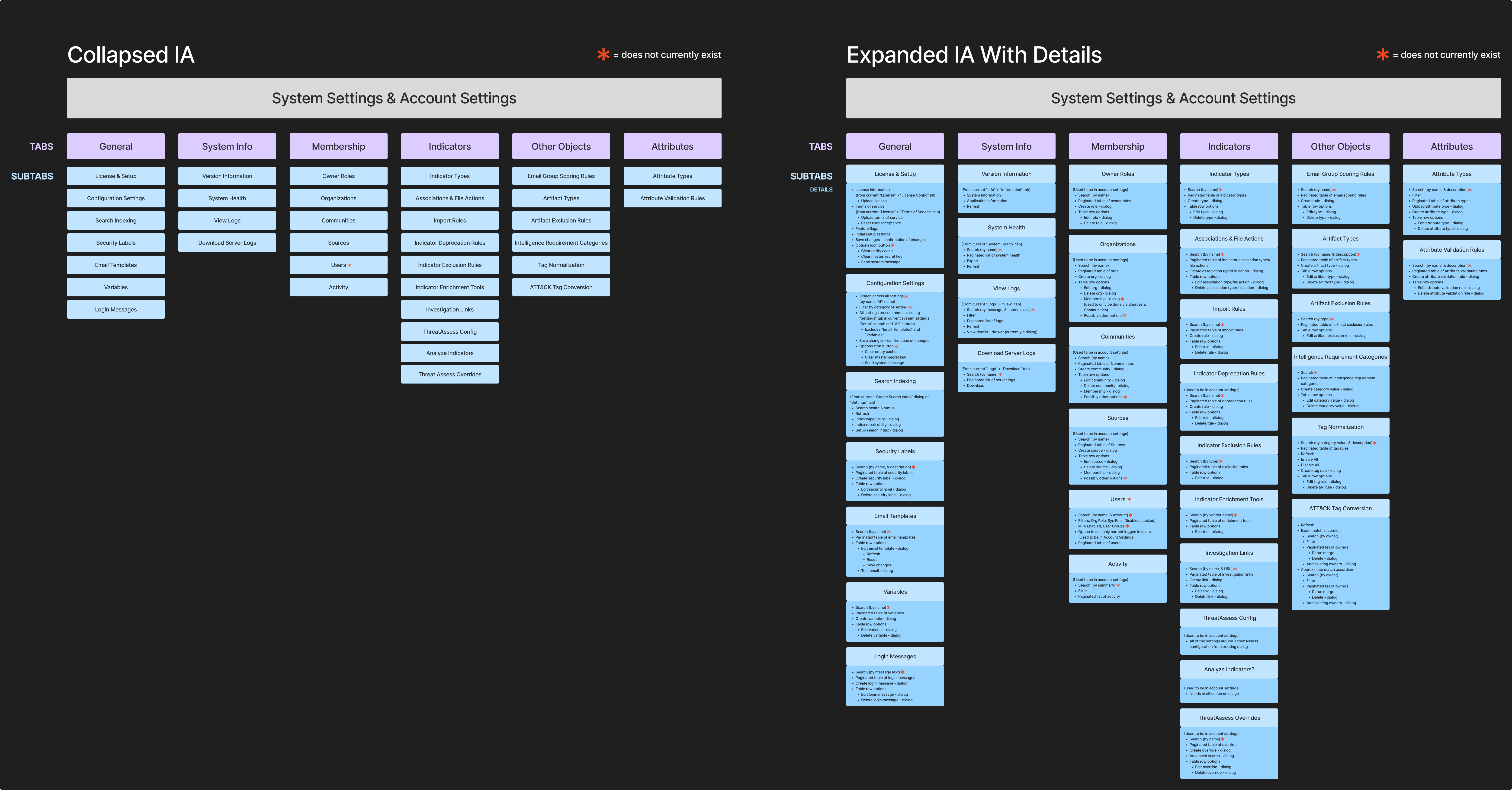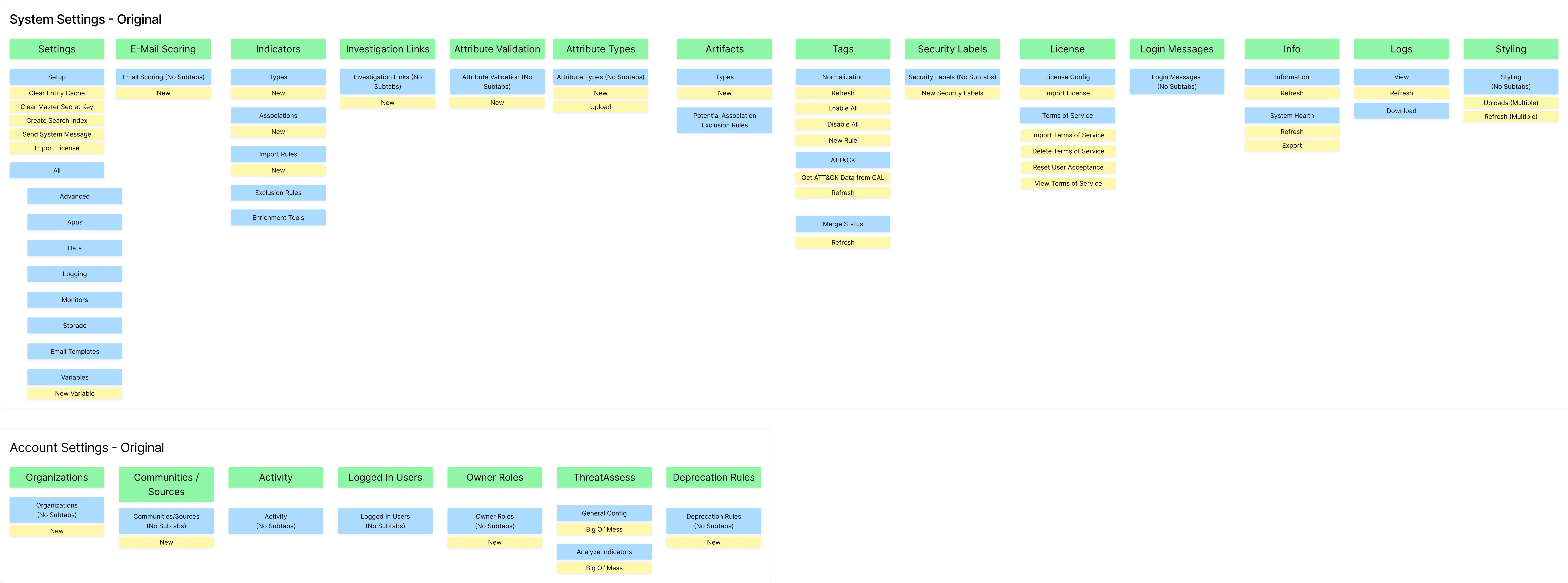 The administrative parts of the ThreatConnect threat intelligence platform (TIP) were developed a decade prior to redesign, in a way that was not scalable or sustainable. Additional settings were largely added in an ad-hoc manner, causing the settings to become bloated and cumbersome for internal and external users.This herculean endeavor was undertaken by both developers and UX, with UX completely reimagining the IA and design.