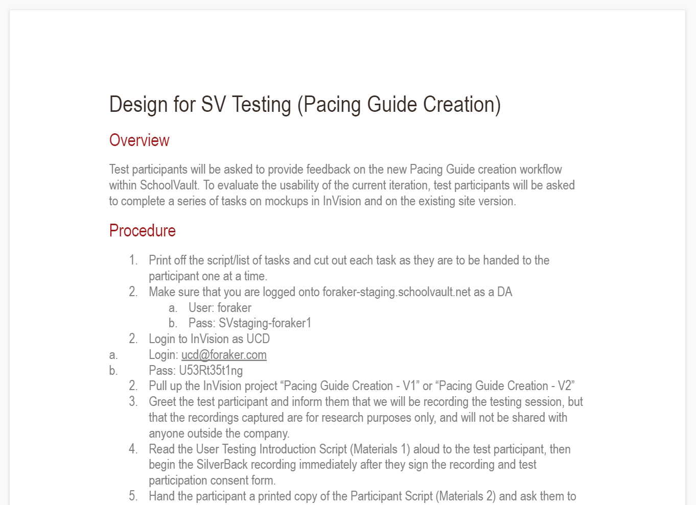 Test participants were asked to provide feedback on the new Pacing Guide creation workflow within SchoolVault. To evaluate the usability of the current iteration test participants were asked to complete a series of tasks on two different mockups, one in InVision and the other on the existing site version.