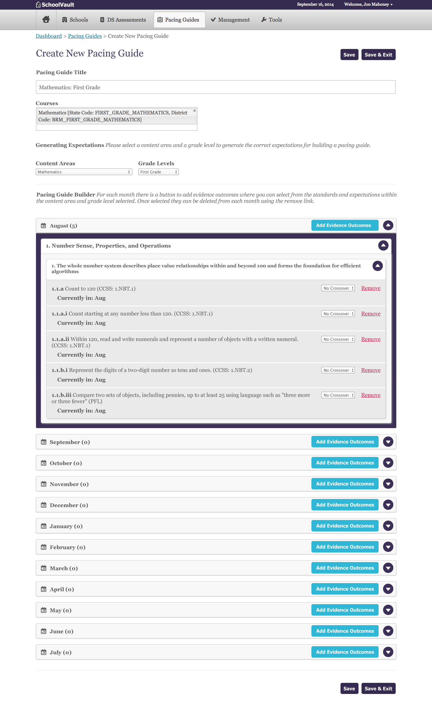 This specific study is on the usability testing performed for “Pacing Guide” creation. A pacing guide is a calendar-based timeline created by the district from the Colorado Academic Standards. It lists specific knowledge and skill indicators, called “Evidence Outcomes,” that teachers are expected to cover. These individual EOs are grouped into larger “Expectations”, as defined by the Colorado Department of Education.