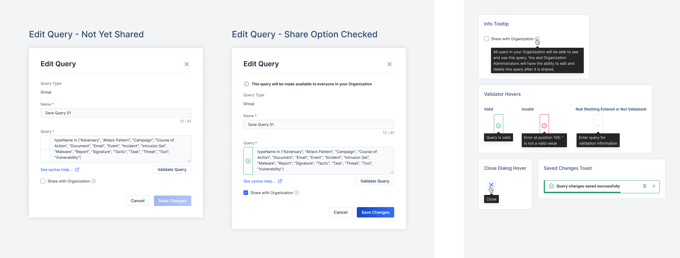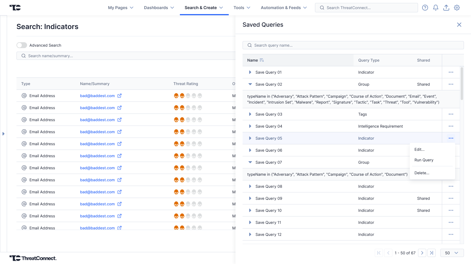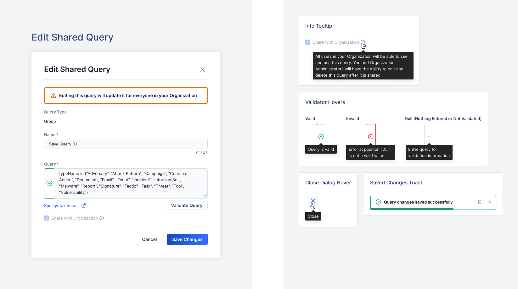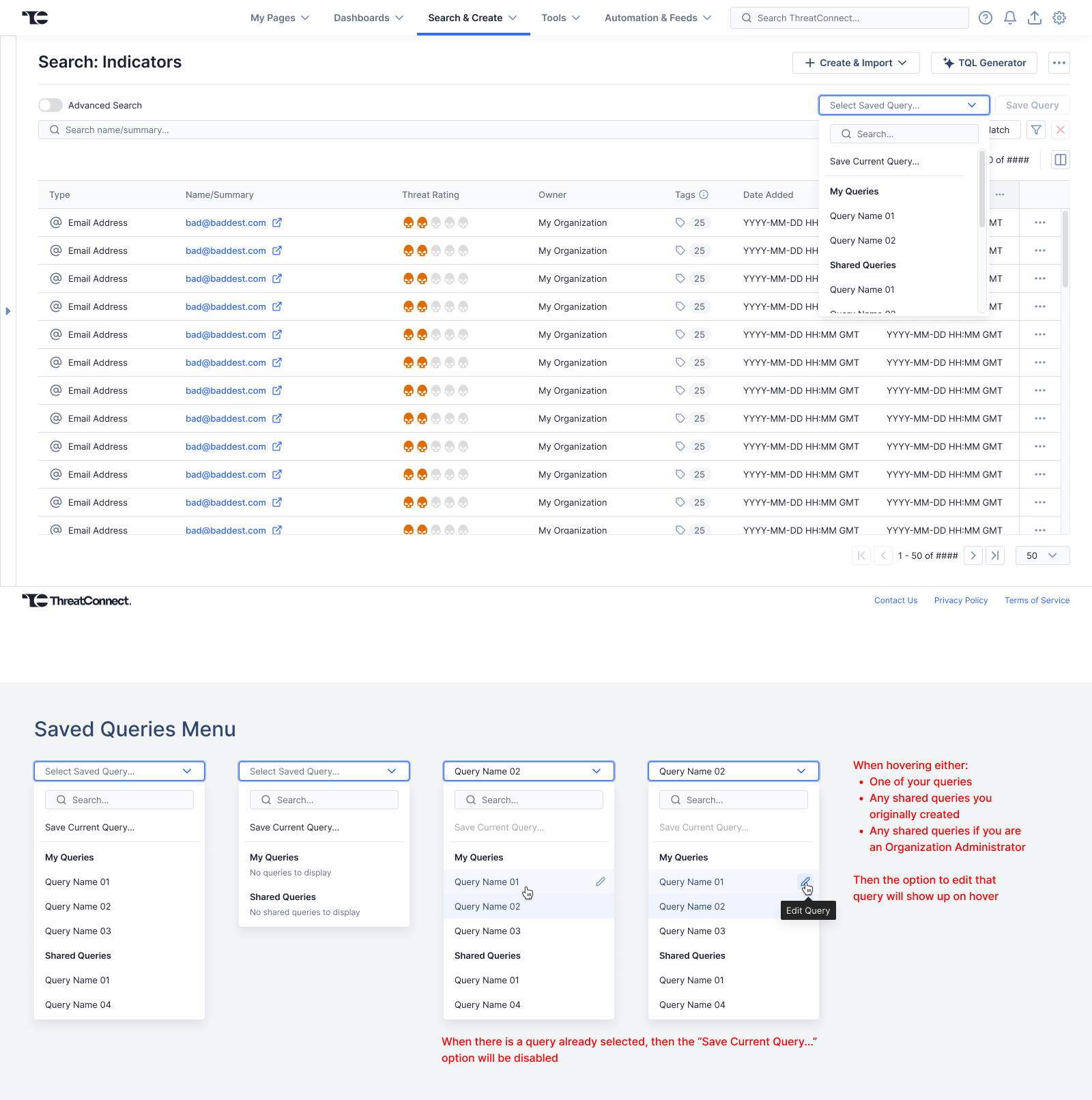 TQL is a proprietary SQL-based query language used within the ThreatConnect threat intelligence platform (TIP). Users have the ability to save their queries for use across the platform. As we expanded the areas of use for saved TQL queries, customers began to request the ability to share saved queries with colleagues and with their larger organization.