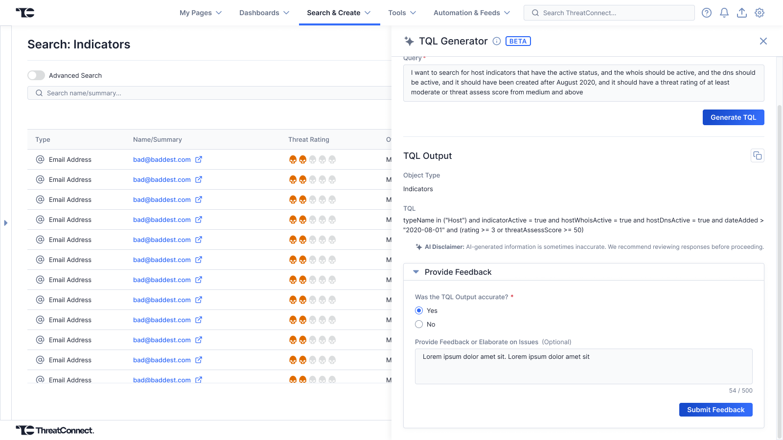 We started with a trial available to a small group of customers prior to rolling it out to the larger customer-base. An interface was designed in which users could write their desired query using normal English-language text to generate an advanced TQL query. They could then provide feedback on the quality and accuracy of the query, allowing for future improvements. After the query was generated, users would have the option to copy the query, save said query for future use, or instantly run the query within search.
