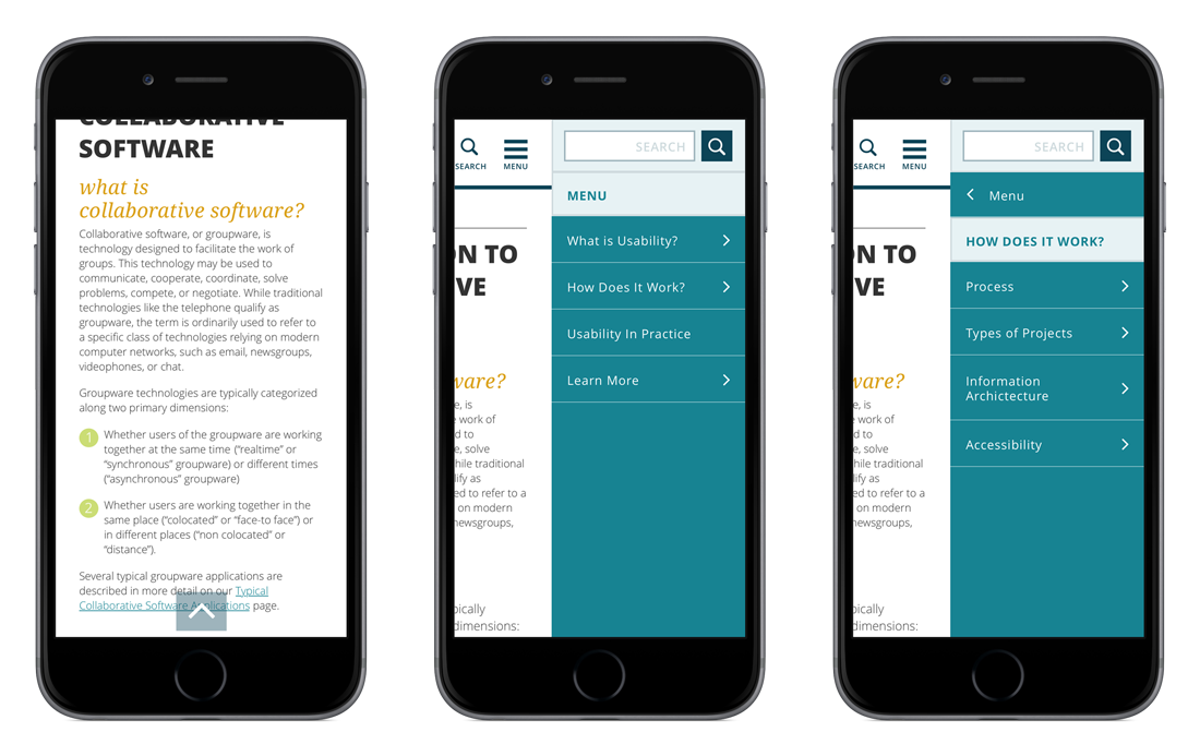 The interior page design incorporated various visual elements to break up the body copy. Each page had a sidebar of related topics. In mobile format the related topics sidebar would live beneath the main content.