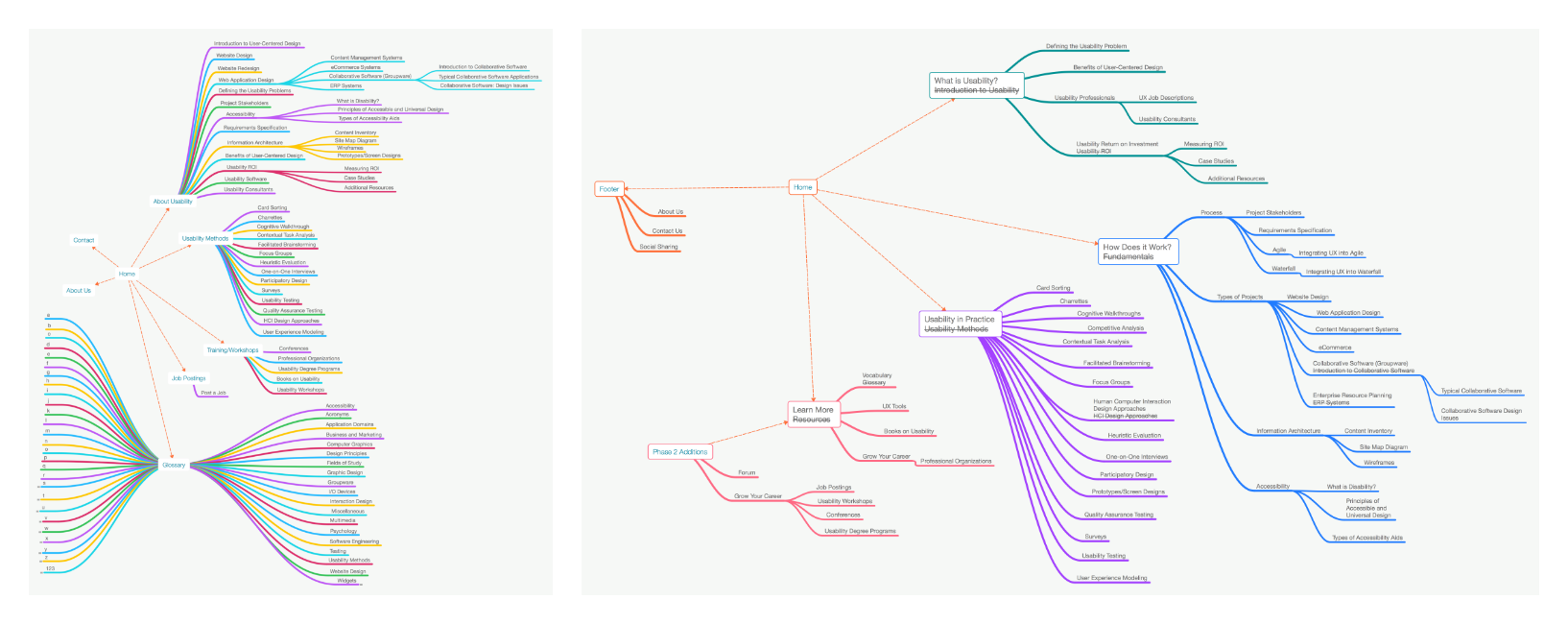 Taking the information gained from the card sort helped with refreshing the IA of Usability First. Our small team sketched ideas around navigation and IA as well.